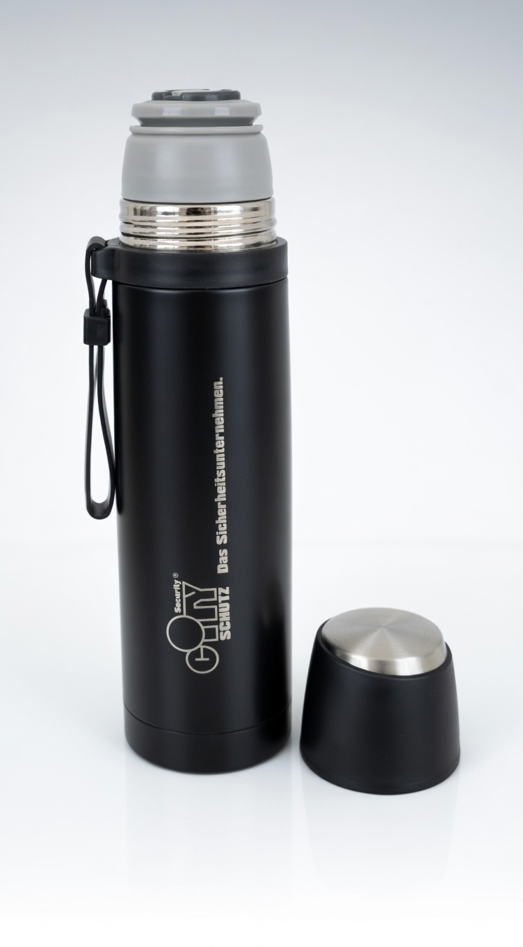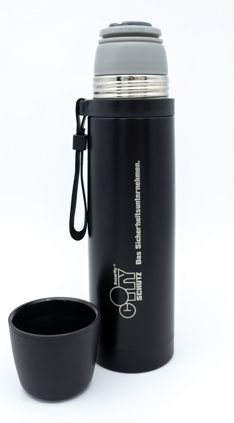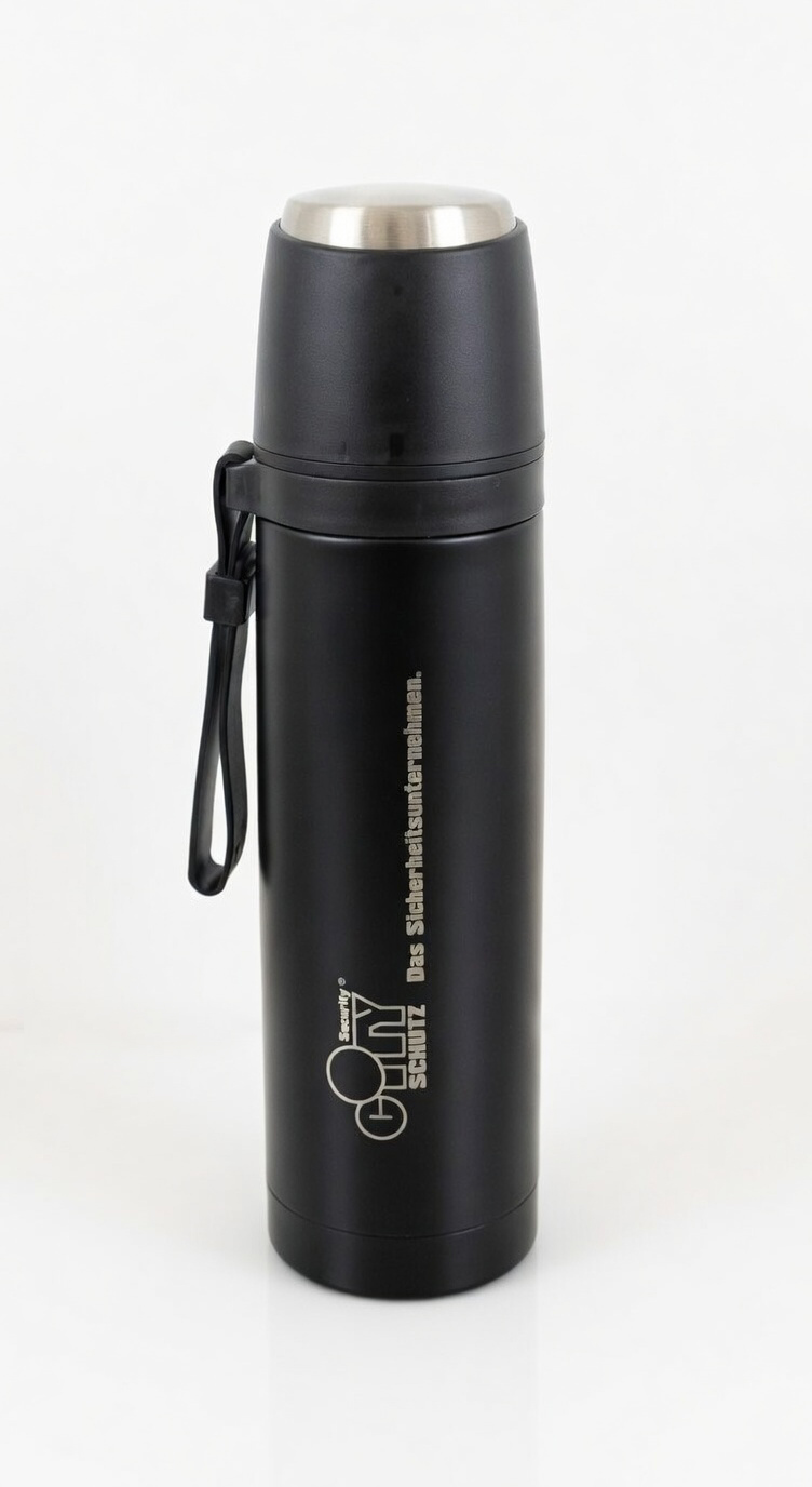 Doppelwandige vakuumierte Isolierflasche mit integriertem Trinkbecher, praktischem Einhand-Verschluss und Trageschlaufe. Hält dein Getränk 5 Stunden warm bzw. kalt.
